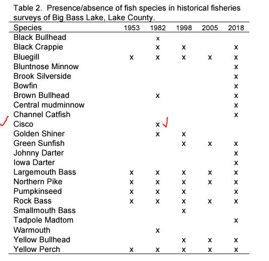 Big Bass Lake is mostly shallow under 20’, has some gravel bottom and is documented by the DNR to have Ciscoe fish in a 1982 net count by the USDA, see Figure 3. Our suspicion is Ciscoes travel through the channel to spawn on the gravel and stone or just infrequently end up there foraging for food. They are not common or fished for in Big Bass Lake.