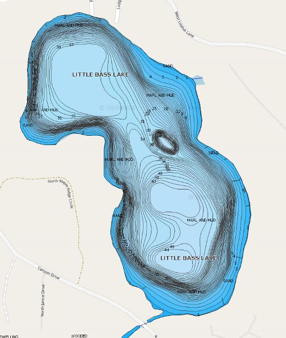 Little Bass has mostly clear, blue water and most days there is hardly a chop on the surface as most of the shore hosts trees north of 40’. Little Bass Lake’s steep drop offs end up at about 30 to 35’ and there are about three areas that are greater than 45’ deep, see Figure 2.
